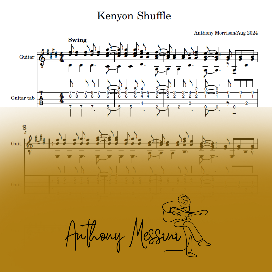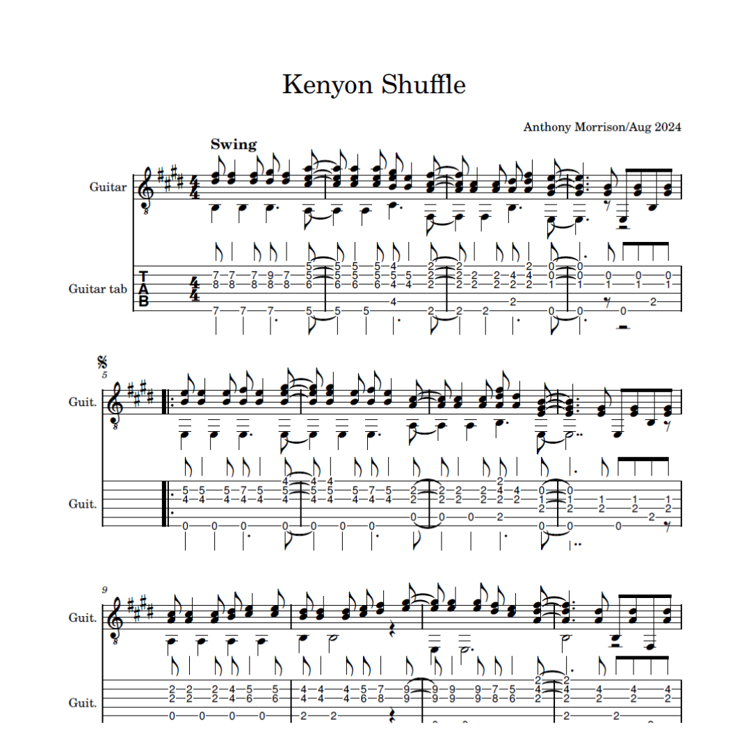 An arrangement for solo guitar in both manuscript and tablature of an original piece of music "Kenyon Shuffle" - Anthony Messini (Video on Instagram feed)