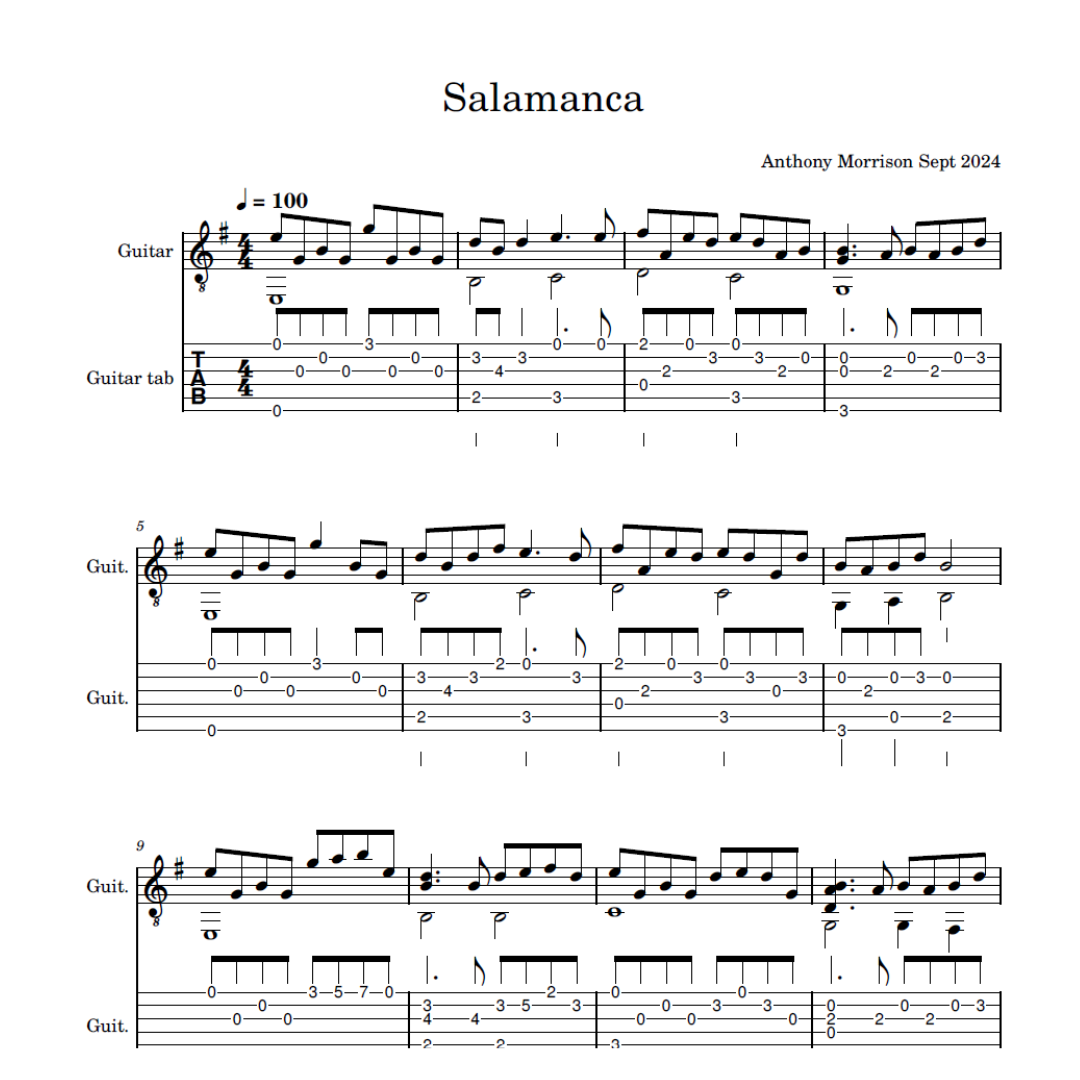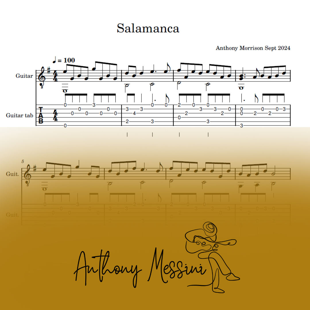 An arrangement for guitar in both manuscript and tablature of an original piece of music "Salamanca" - Anthony Messini (released on Spotify early Jan 2025)