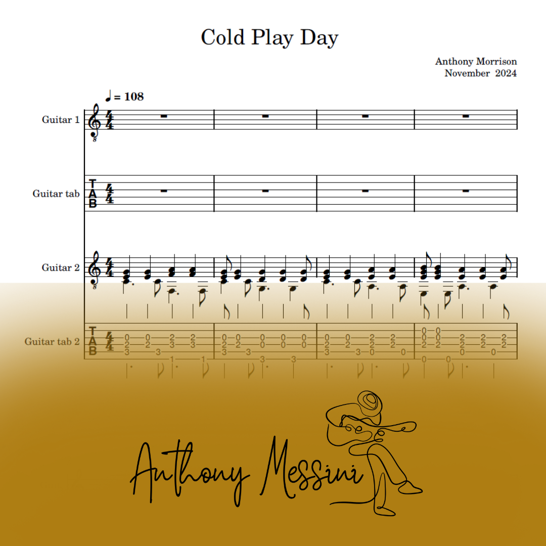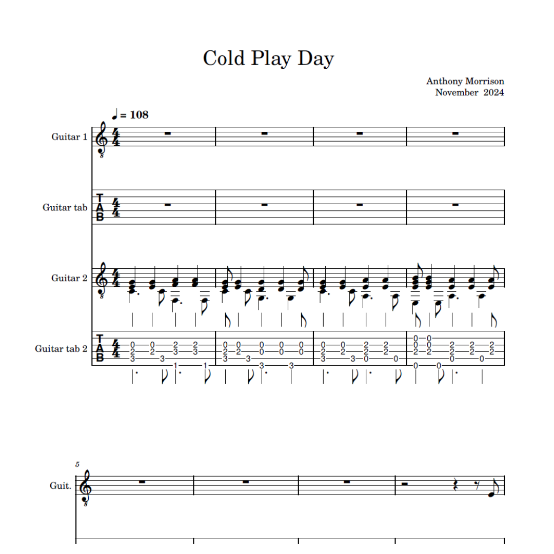 An arrangement for two guitars in both manuscript and tablature of an original piece of music "Cold Play Day" - Anthony Messini (Released on Spotify Jan 3 2025)