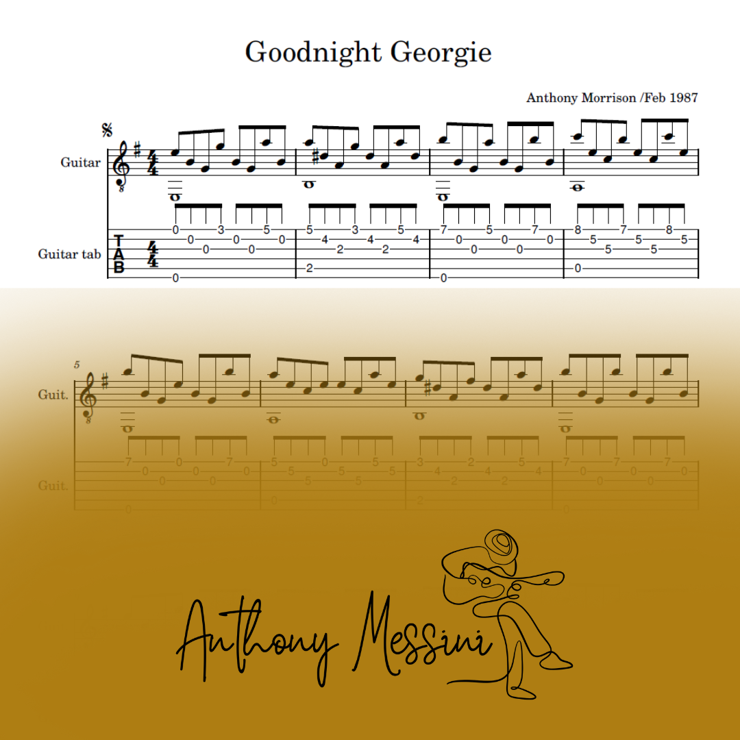 An arrangement for Solo guitar in both manuscript and tablature of an original piece of music "Goodnight Georgie" - Anthony Messini (Video on Instagram feed)