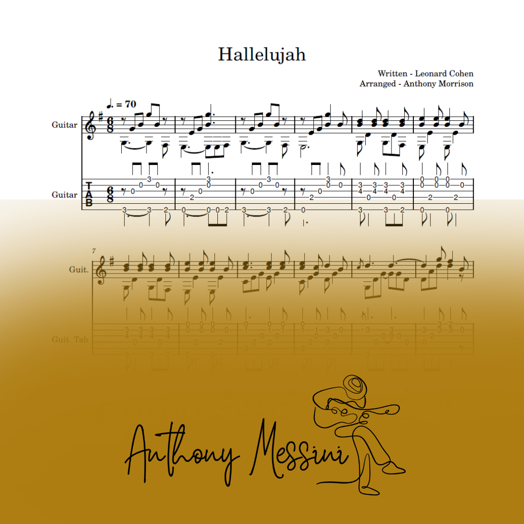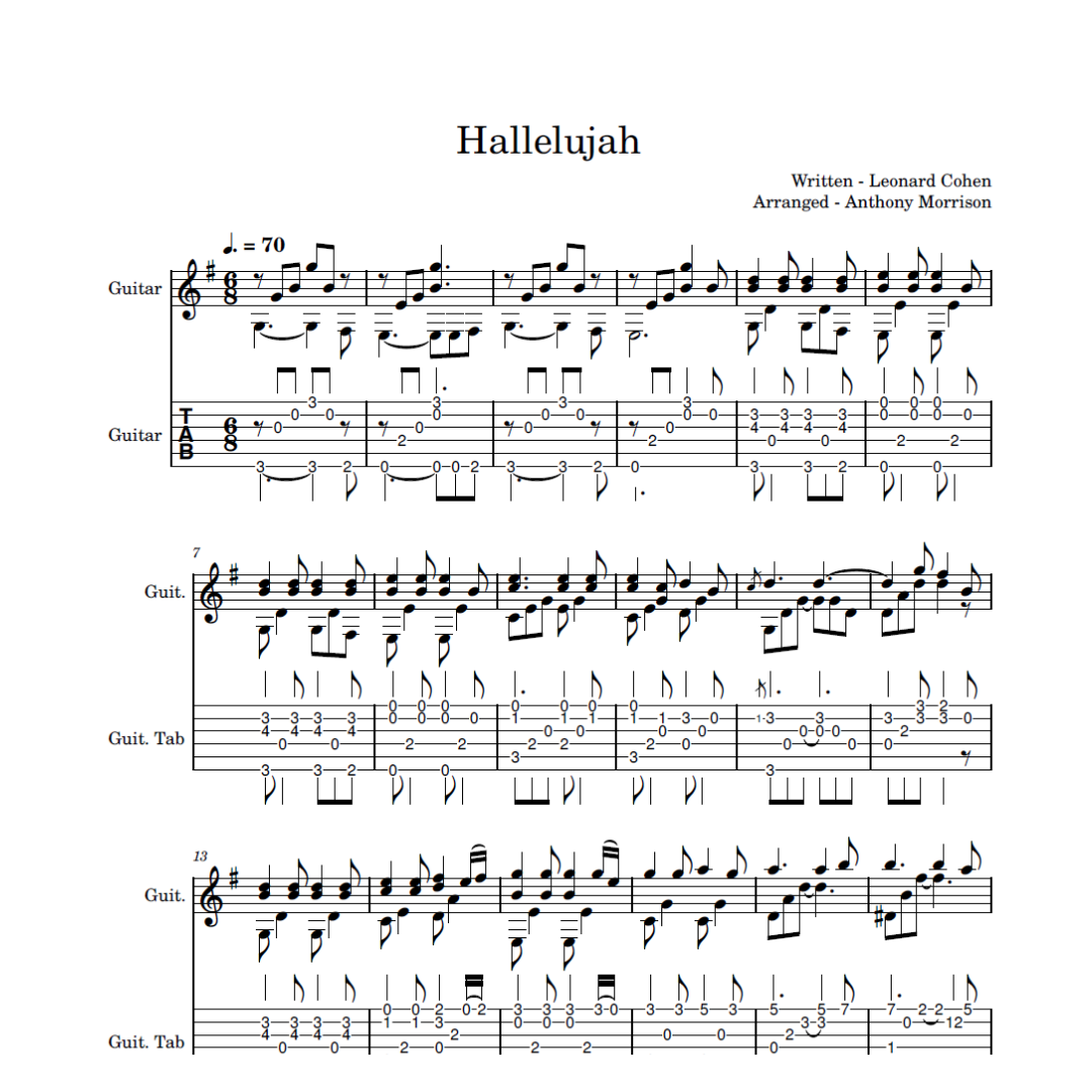 An arrangement for solo guitar of the 1984 Leonard Cohen classic, "Hallelujah".