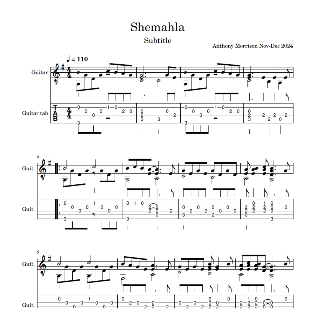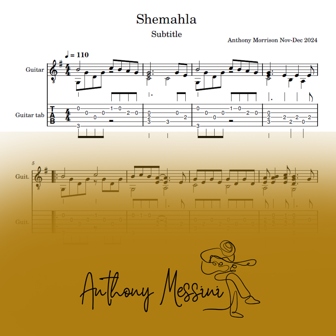 An arrangement for solo guitar in both manuscript and tablature of an original piece of music "Shemahla" - Anthony Messini (video on Instagram Feed)