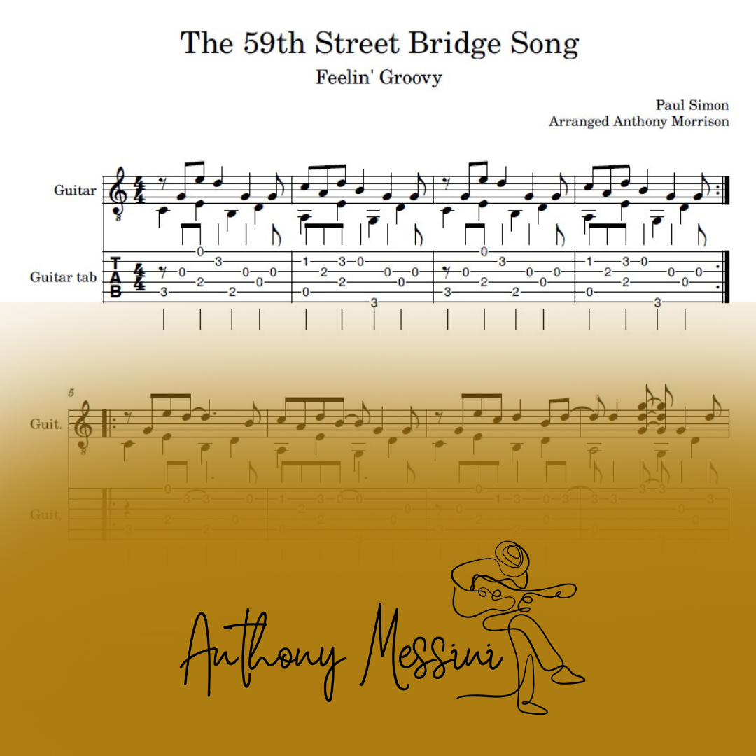 An arrangement for guitar in both manuscript and tablature of the popular song “The 59th Street Bridge Song” ~ Paul Simon