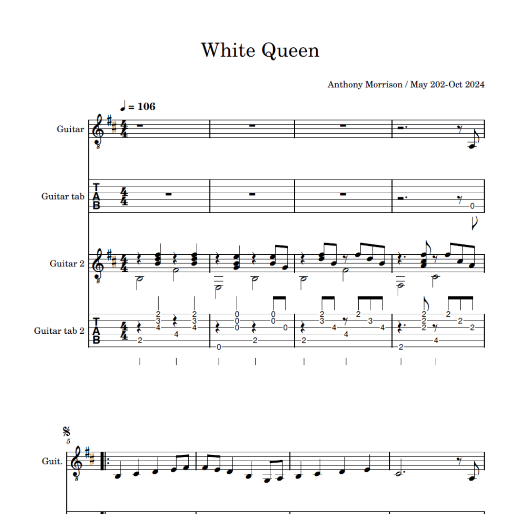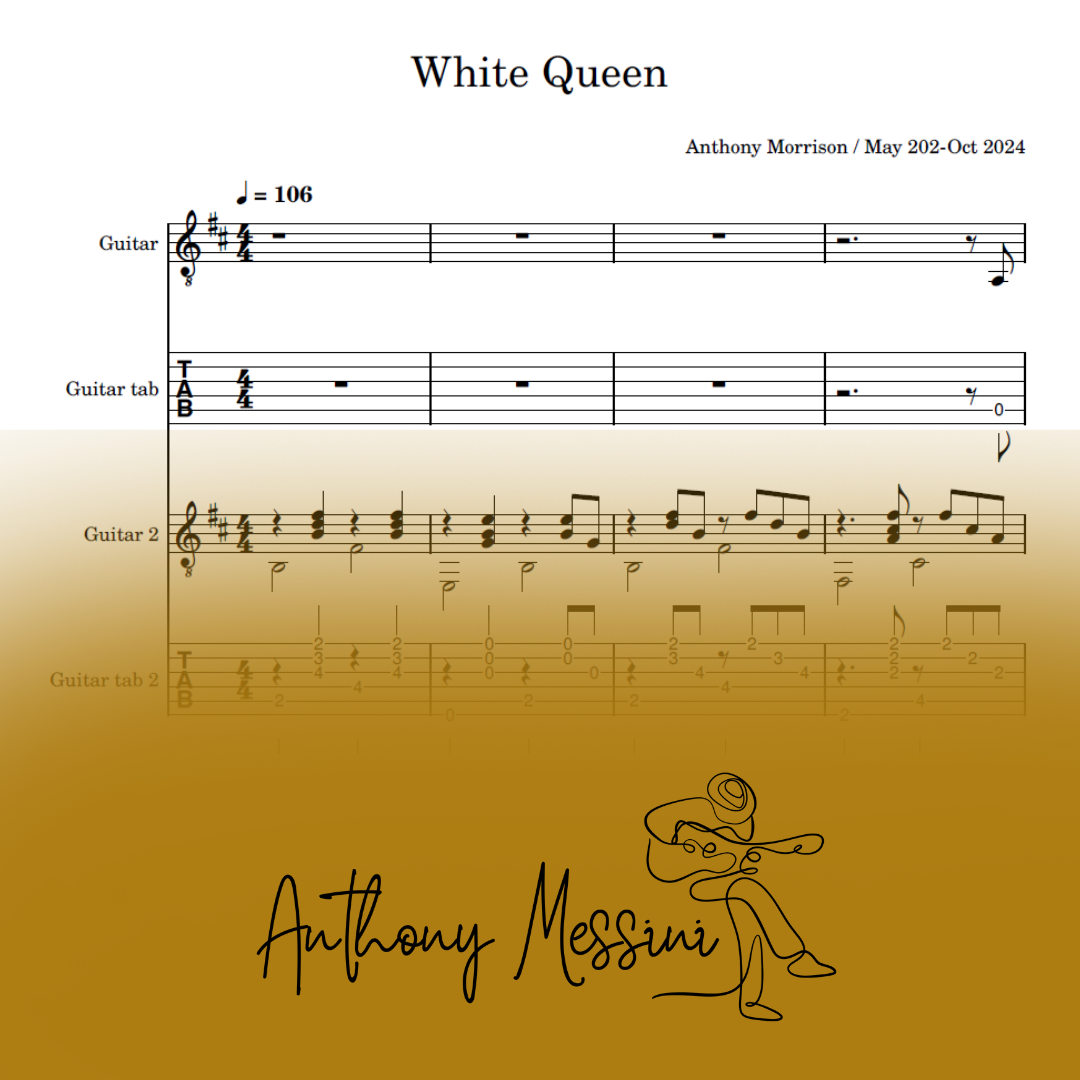 An arrangement for two guitars in both manuscript and tablature of an original piece of music "White Queen" - Anthony Messini (released on Spotify Mid Jan 2025)